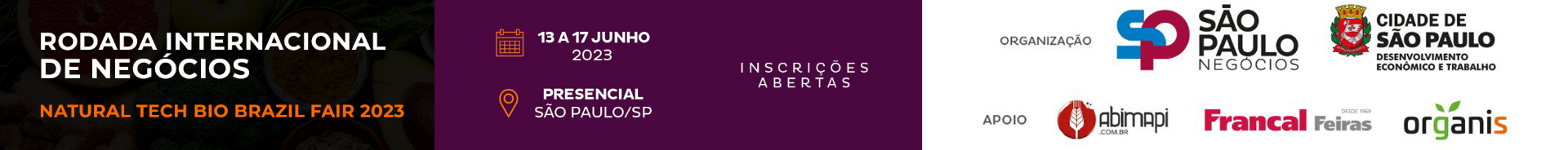 15h30 às 19h00: Visita às feiras Natural Tech e Bio Brazil Fair 2023, com continuação das rodadas nos estandes das empresas expositoras.